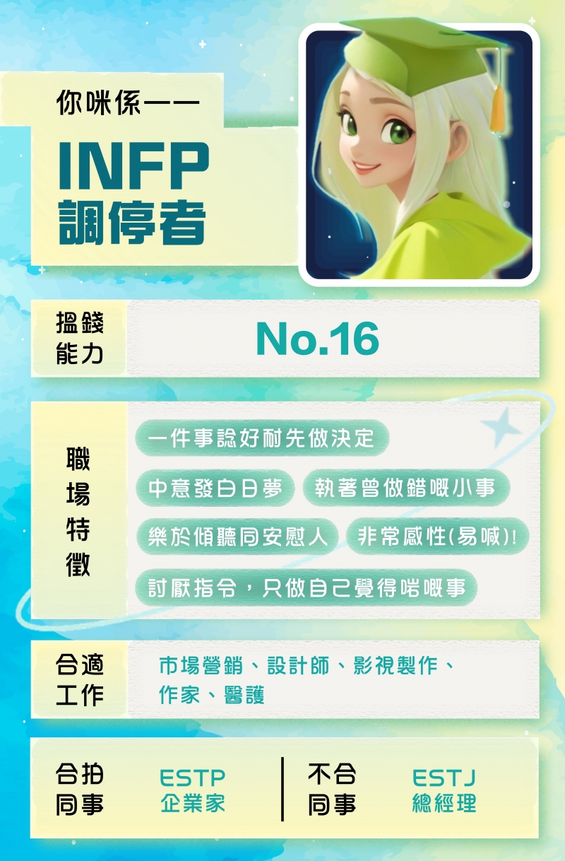 INFP好中意發白日夢,諗法天馬行空,而且係理想主義者。佢哋希望搵到一份人工OK冇乜壓力,又有滿足感嘅工作,係米聽到都覺得天馬行空呢?另一方面,佢哋會花好多時間去諗一件事,唔到最後一刻都唔做決定。